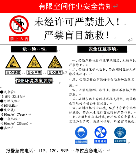 - Confined Work Area and Safety Warnings: Prominent locations at confined space work areas and their entrances must display a “Confined Space Work Safety Risk Board.” Below is an example of the display format provided in Annex B of the standard:
