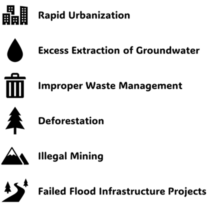 Deforestation and poor land management in upland areas further exacerbate flooding. The loss of forest cover reduces soil stability and water retention, leading to increased surface runoff10. In relation to deforestation, activities such as illegal mining or unregulated quarrying alter the terrain, causing landslides and also increasing surface runoff11.