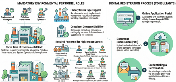 Under these regulations, “Environmental Personnel” are individuals responsible for overseeing and operating pollution prevention systems within a factory. They fall into three distinct roles: